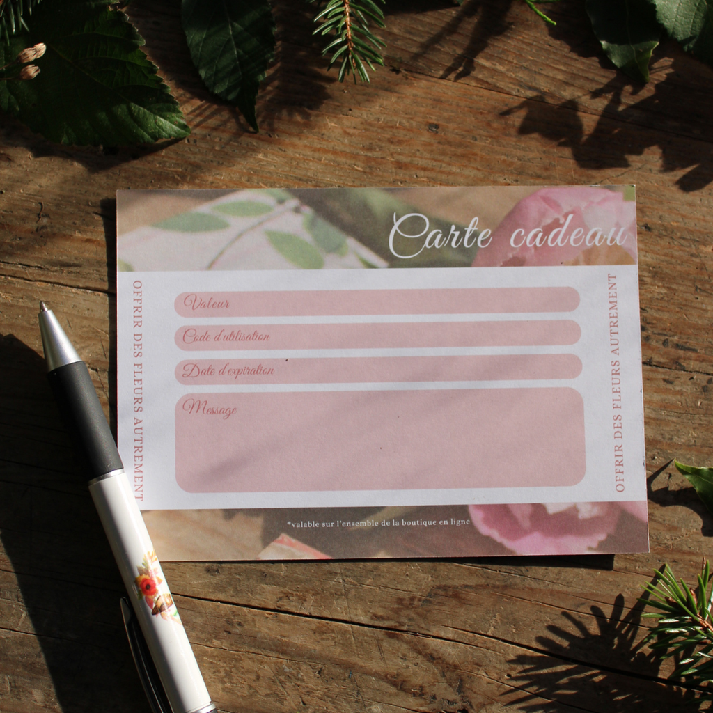 La carte cadeau inclura un code à saisir lors de l'achat. Elle sera valable pendant 2 mois à partir de la date d'achat.